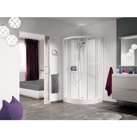Cabine de douche accès d’angle avec portes coulissantes en verre transparent.Panneaux de fond en acryl thermoformé intégrant des étagères portes-flacons. Receveur de 18cm en Biocryl naturellement non glissant sur pieds réglables avec grille d’évacuation en inox polo. Équipement complet : robinetterie, douchette à mains à jets réglables avec flexible, barre de douche, flexibles d’alimentation, bonde et tuyau d’évacuation. Profilés en aluminium laqué blanc. Hauteur total de la cabine : 208cm. Montage express.
